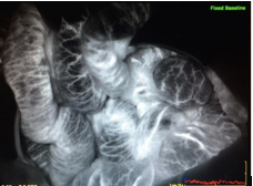 Fluorescence angiography (FA) utilizing indocyanine green (ICG) has been used for decades to assist with ophthalmic operations¹. Recently, its use has become more common in the management of myocutaneous flaps, ostomy and intestinal anastomoses. The use of ICG dye angiography in determining the viability of bowel and how it affects the surgeon’s management is relatively unknown. Below is a case of a 63-year-old male who presented in the intensive care unit (ICU) with an acute abdomen concerning for ischemic bowel. Fluorescence angiography was a key adjunct for the operative decision making for this patient.Published