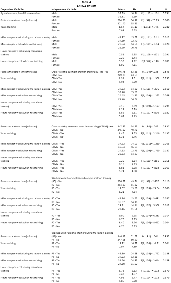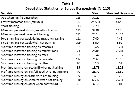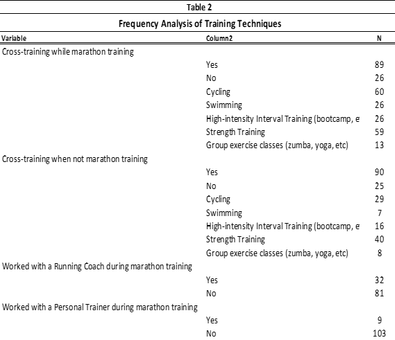 Marathon running has increased in America among non-elite runners. The purpose of this study was to examine the training methods of non-elite runners. 115 participants, 58 male and 57 female completed a survey regarding their training practices. Results determined that males ran faster (P= .000) and more miles while training for a marathon (P = .015) and when not training (P = .020) than women. While these findings may provide a better understanding of non-elite runners, further research should be conducted to better understand them. This study provided an overview of the training practices of non-elite marathon runners.