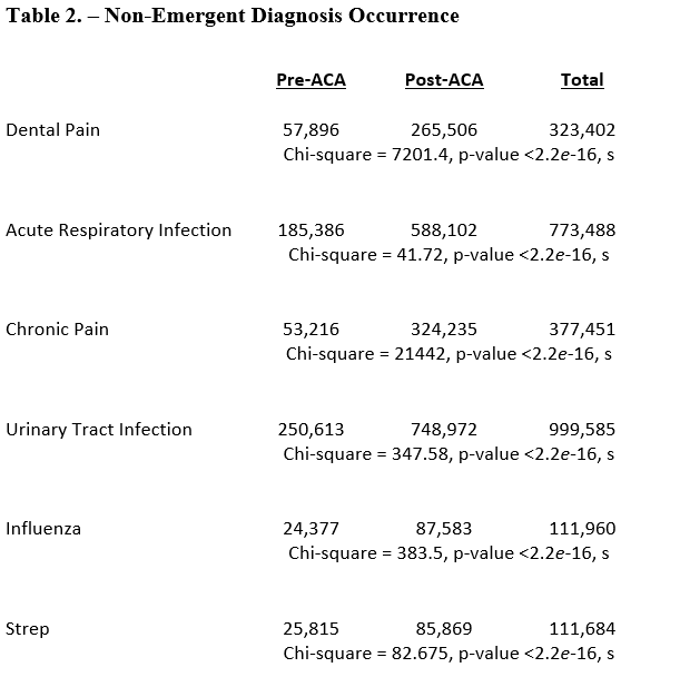 Comparison of Emergency Room Utilization for Non-Emergent Purposes Before and After the Implementation of the Affordable Care Act